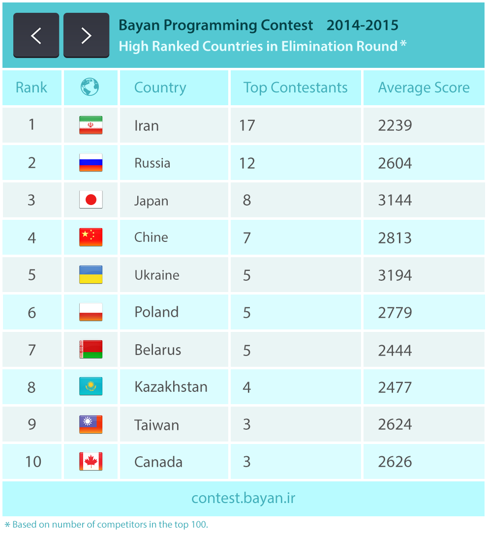 High ranked countries in Bayan Programming Contest 2014-2015.Based on number of competitors in the top 100.