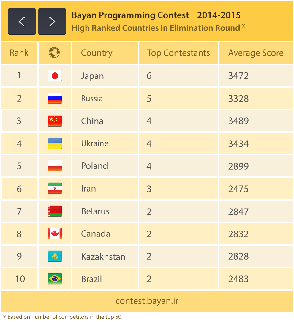 High ranked countries in Bayan Programming Contest 2014-2015.Based on number of competitors in the top 50.
